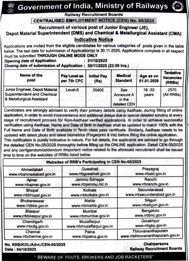 RRB JE Notification 2025: Key Highlights