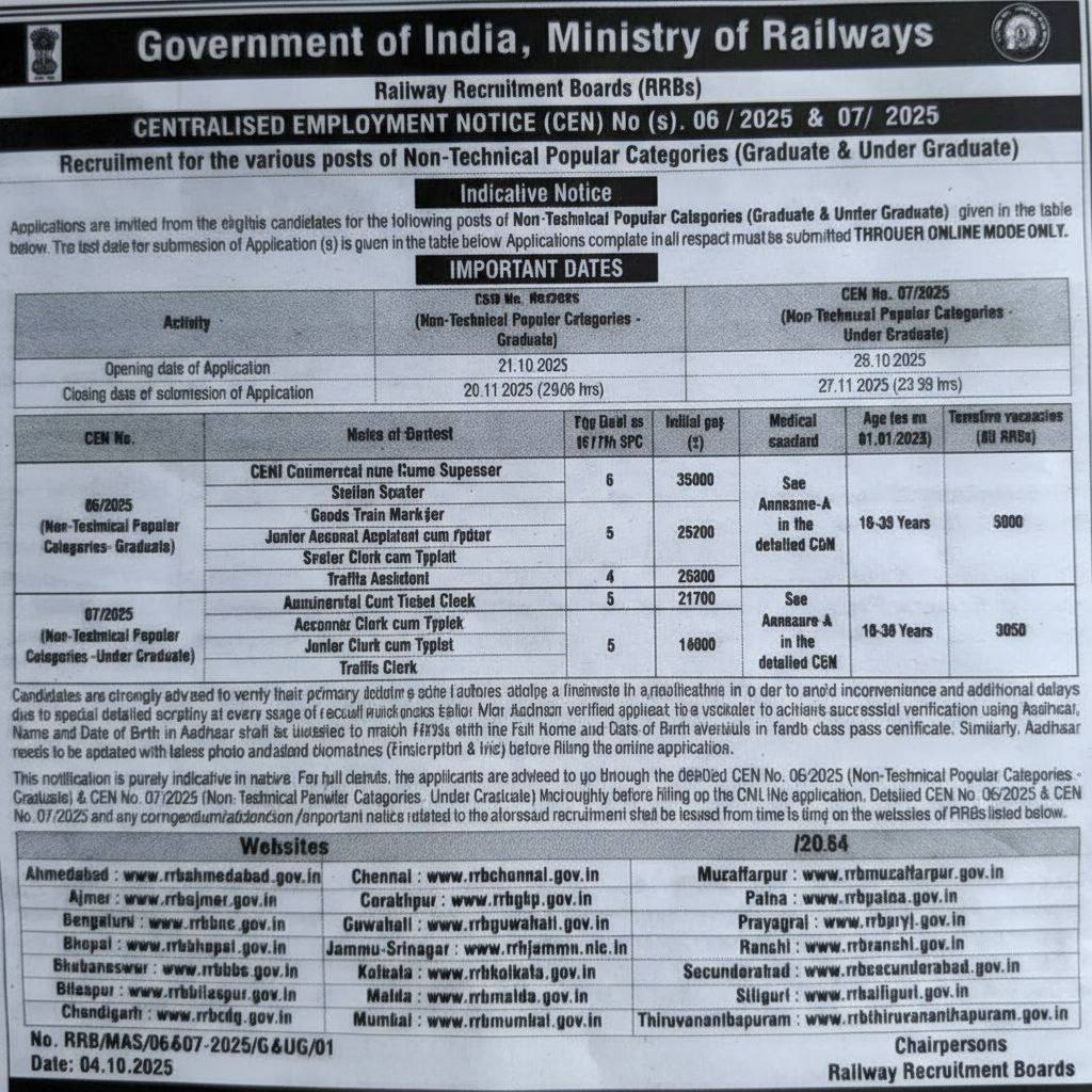 RRB NTPC Recruitment 2025 is your golden opportunity! With 8850 vacancies announced for Non-Technical Popular Categories (NTPC), this drive promises exciting roles like Station Master, Goods Guard, Junior Clerk, and more. The short notice has been released, and applications are set to begin soon. Mark your calendars—the last date to apply for undergraduate posts is 27 November 2025. Don’t miss out on this chance to secure a rewarding career in one of India’s largest employers.